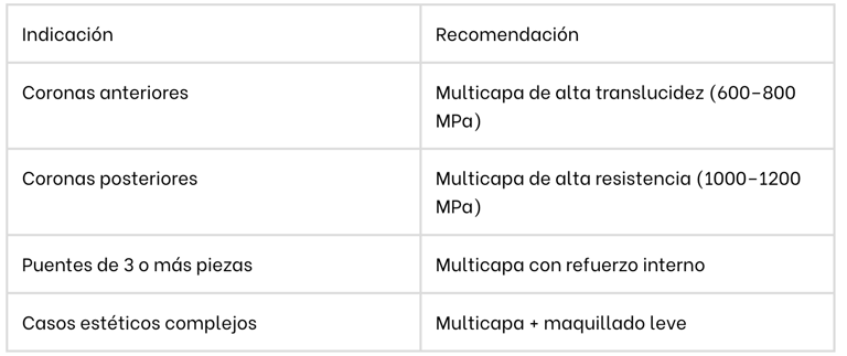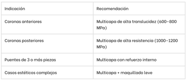 Aunque existen diferentes tipos según la indicación (de 600 MPa a más de 1200 MPa), la mayoría de los zirconios multicapa combinan una estética excelente con resistencia suficiente para zonas posteriores.